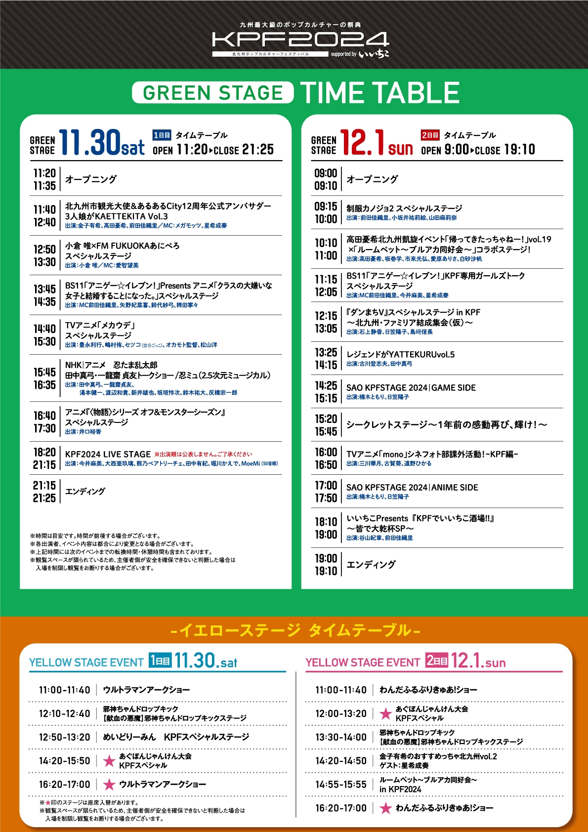 ※時間は目安です。時間が前後する場合がございます。 ※各出演者、イベント内容は都合により変更となる場合がございます。 ※上記時間には次のイベントまでの転換時間・休憩時間も含まれております。