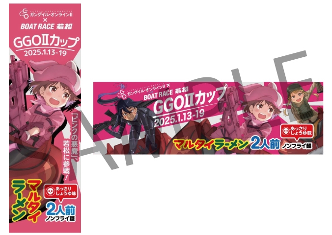 恒例となったボートレース若松のアニメコラボレース、今回は「ソードアート・オンライン オルタナティブ ガンゲイル・オンラインⅡ」とのコラボが決定!KPF会場の特設ブースでは、描き下ろしイラストを使用したオリジナルパッケージのマルタイ棒ラーメンやKPF会場限定グッズの抽選会の他、ラッピングバスのお披露目展示を行います。