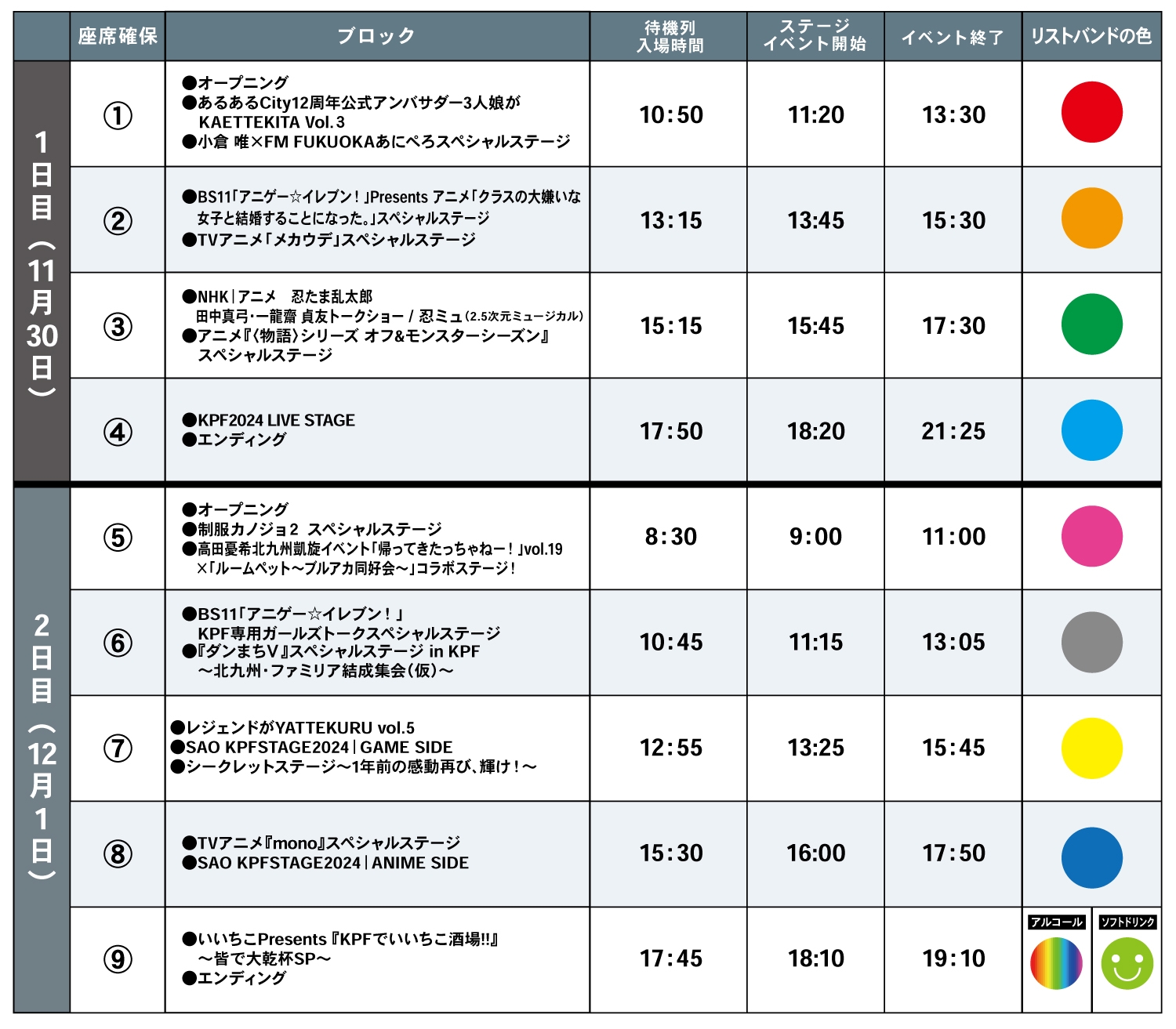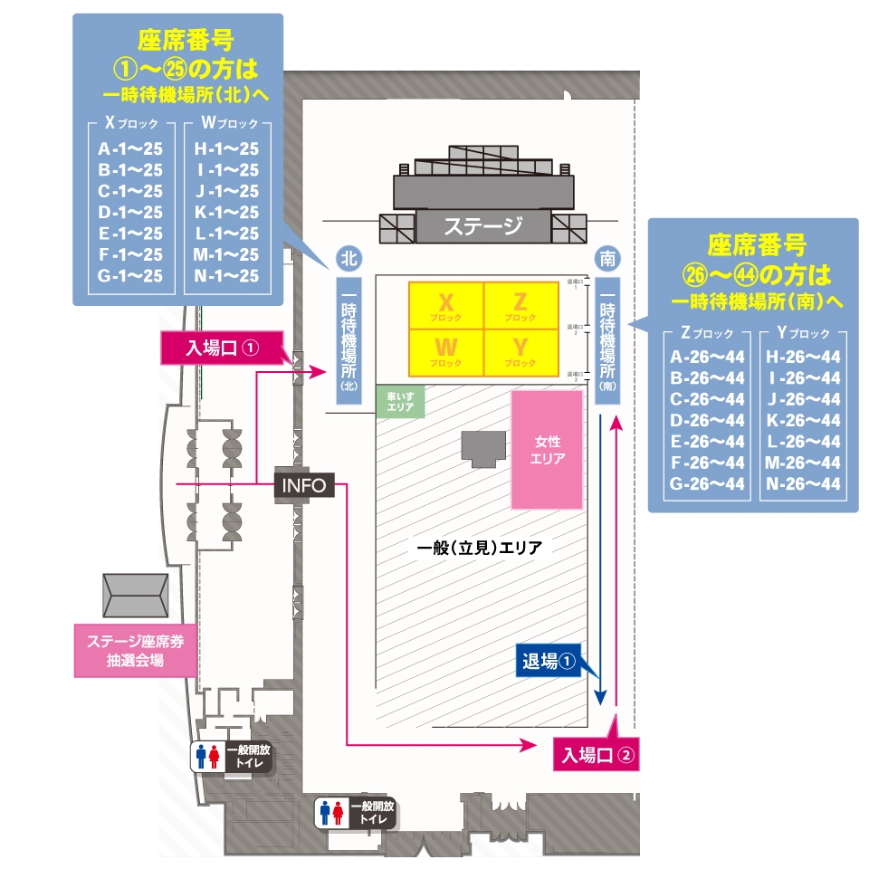 ・リストバンドをお持ちの方は、各ブロックの待機列入場時間より一時待機場所をご利用いただけます。