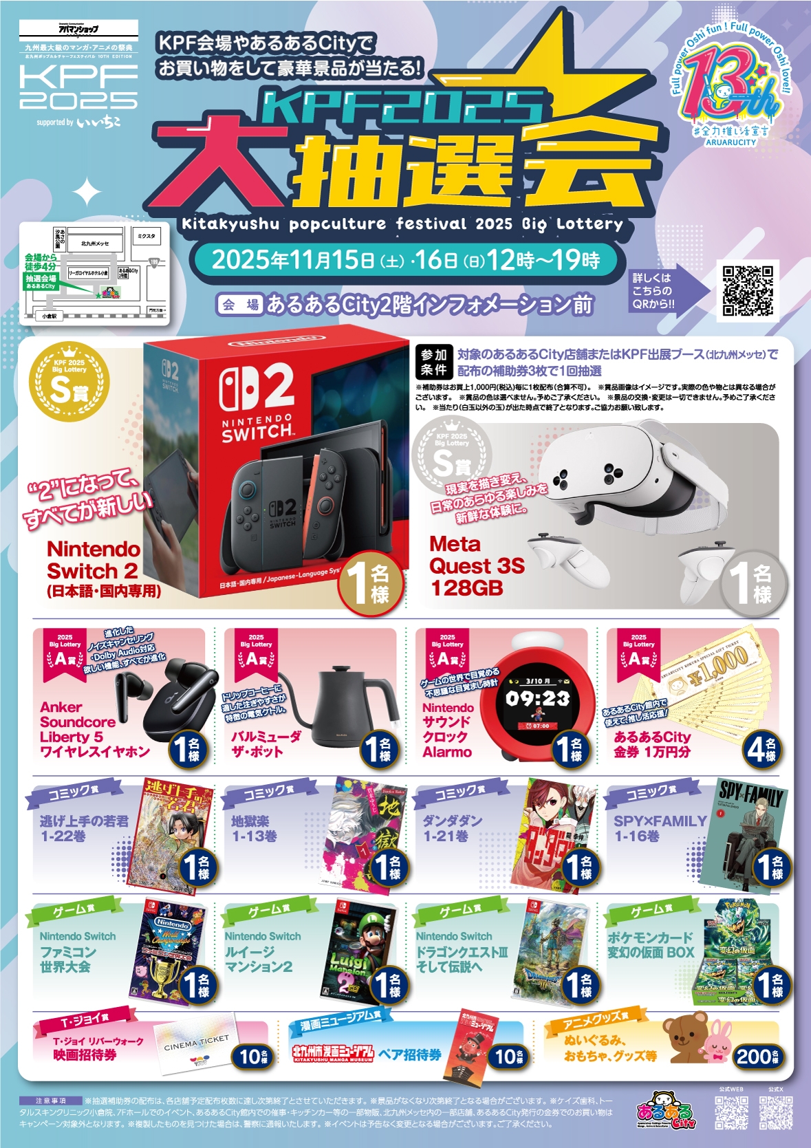 対象のあるあるCity店舗またはKPF出展ブース(北九州メッセ)で配布の補助券3枚で1回抽選