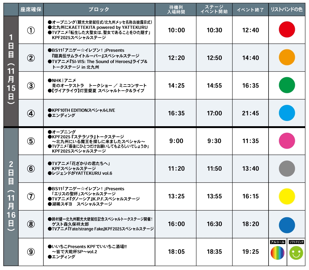 ・リストバンドをお持ちの方は、各ブロックの待機列入場時間より一時待機場所をご利用いただけます。